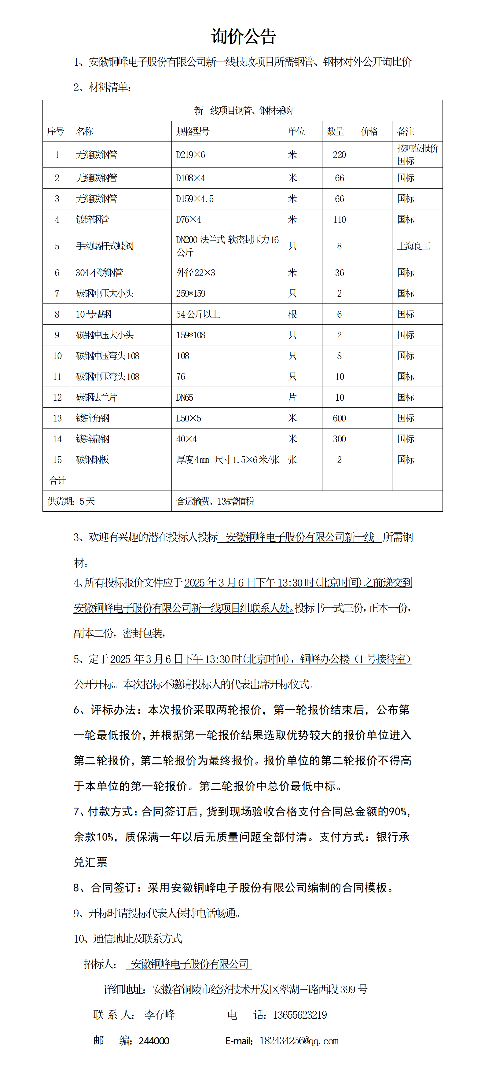 安徽銅峰電子股份有限公司新一線項目鋼材詢價公告_01