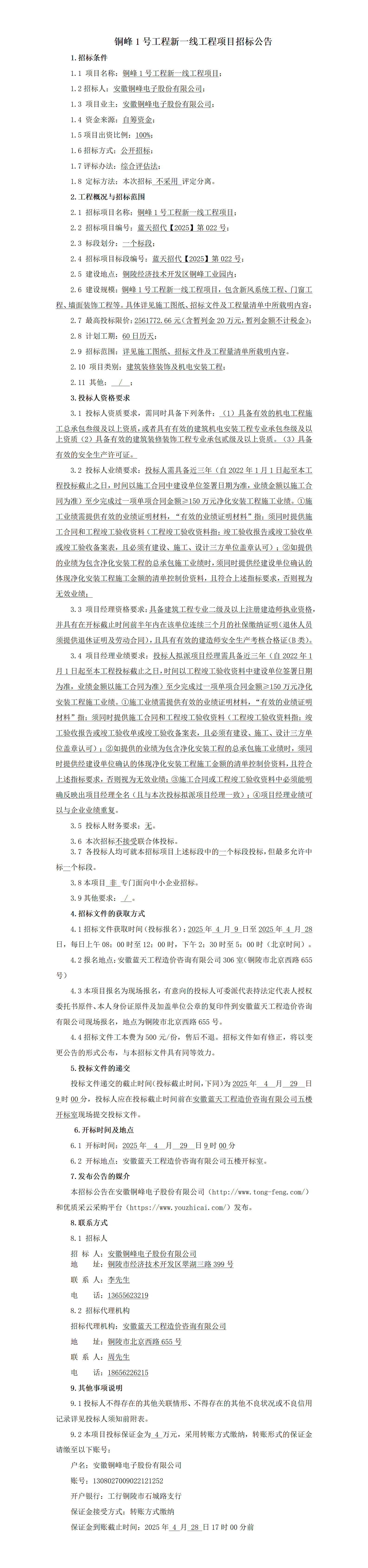 銅峰1號工程新一線工程項目招標(biāo)公告