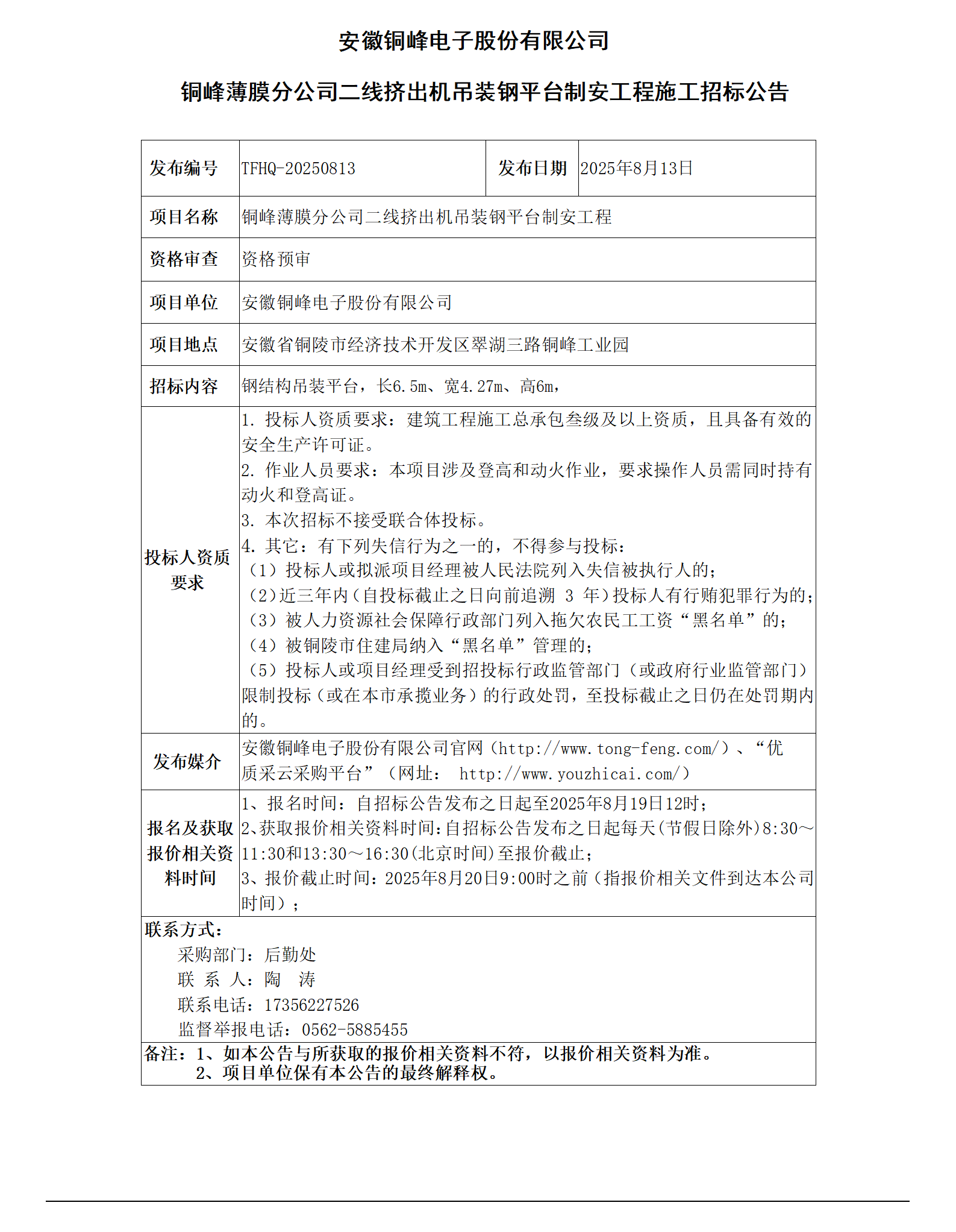 安徽銅峰電子股份有限公司 (銅峰薄膜分公司二線擠出機吊裝鋼平臺制安工程招標公告)_01