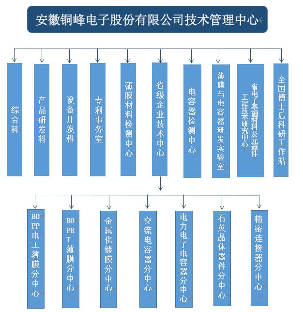 銅峰公司為國(guó)家高新技術(shù)企業(yè)、國(guó)家火炬計(jì)劃重點(diǎn)高新技術(shù)企業(yè)、國(guó)家火炬計(jì)劃銅陵電子材料產(chǎn)業(yè)基地重點(diǎn)骨干企業(yè)。公司建有完整的科研創(chuàng)新組織體系,設(shè)立技術(shù)管理中心作為技術(shù)研發(fā)的總管理機(jī)構(gòu),組織協(xié)調(diào)公司的各分子公司和相關(guān)部門(mén),以確保公司技術(shù)創(chuàng)新精確高效地運(yùn)行。技術(shù)管理中心下設(shè)綜合科、產(chǎn)品研發(fā)科、設(shè)備開(kāi)發(fā)科、專(zhuān)利事務(wù)室、薄膜材料檢測(cè)中心、電容器檢測(cè)中心以及薄膜與電容器研發(fā)實(shí)驗(yàn)室,同時(shí)下設(shè)省級(jí)企業(yè)技術(shù)中心、安徽省電子基礎(chǔ)材料及元器件工程技術(shù)研究中心以及國(guó)家級(jí)博士后科研工作站。
